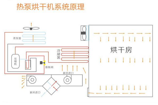 空气源热泵億彩烘干机组,主要有翅片式蒸发器(外机)、压缩机、翅片冷凝器(内机)和膨胀阀四部分组成,通过让空气不断完成蒸发(吸取室外环境中的热量)→压缩→冷凝(在室内烘干房中放出热量)→节流→再蒸发的热力循环过程,从而将外部低温环境里的热量转移到烘干房中,冷媒在压缩机的作用下在系统内循环流动。