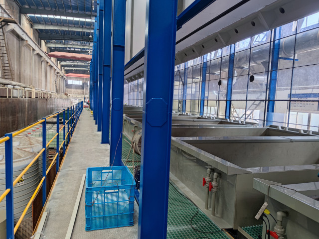 2、酸性脱脂槽:配置4台25匹钛管高温热泵机组直接循环加热