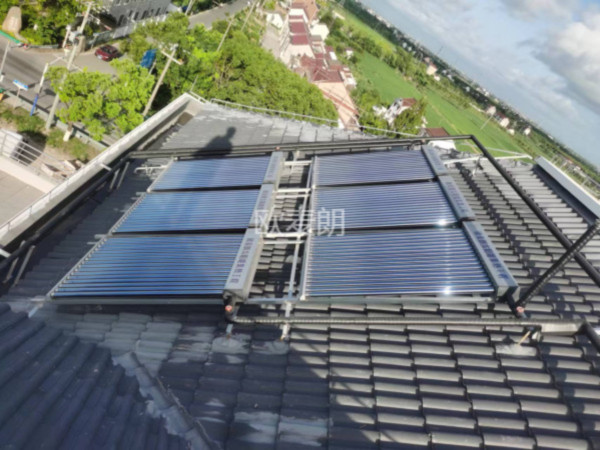 系统配置:一个圆形保温水箱+欧麦朗空气能热泵机组+9组太阳能集热器
