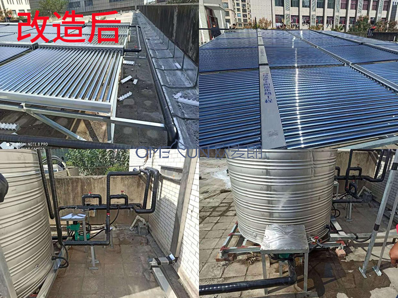 目前整套系统运行下来,效果非常显着,故障率明显比之前低很多,哪怕是天气再冷,也没出现太阳能管被冻坏,用空气源热泵代替电加热,全年下来,电费也节省了将近一半,符合节能环保绿色时尚的理念,推动了太阳能和空气能在安徽地区的使用。