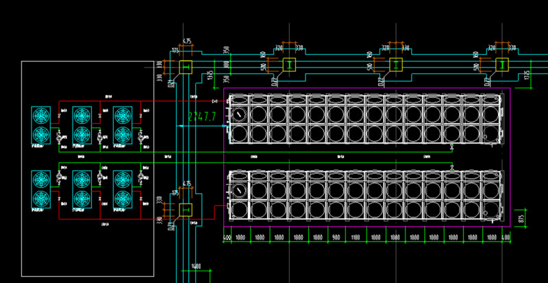 我们根据当地的气候情况,再根据13个公寓,两个食堂的热水需求量,来配置了6台空气源热泵和两个水箱,加上循环泵等。如下图: