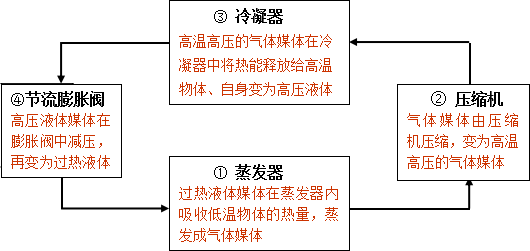 ①过热液体媒体在蒸发器内吸收低温物体的热量,蒸发成气体媒体。