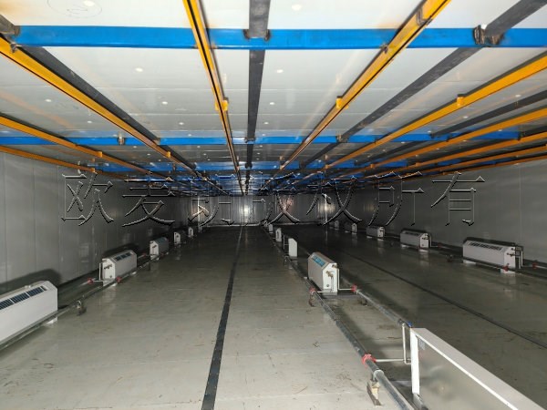 此次我们为客户家具水性漆烘干使用定制设计的烘干热泵机组来实现的。我们根据生产线作业需要,配置了3台欧麦朗热泵烘干机,一个500平的烘房,在烘房顶部配置了自动悬挂线。烘房内部均匀摆放多台风机盘管,用于高温热风的输送。当水性漆喷涂完毕后,家具由悬挂线进入烘房内,再由高温热风烘干后在输送出烘房。