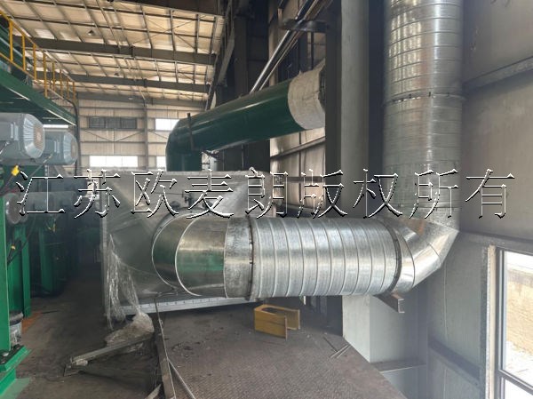 余热回收烟气系统是指将烘干炉烟囟中的高温烟气输送至余热回收器,实现热量传递后,烟气温度降低,再次输送到原烟道排放的一套设备。本项目通过改造烘干炉烟囱,设置手动风阀, 增加水泵、缓冲水箱、安装余热回收装置、采用原有的引风机 自动控制柜等,实现烘干炉烟气余热回收;为保障余热回收器安装后烘干炉工况在正常状态下,原烟道中安装风阀就可以控制烟气通过原烟道还是通过余热回收器的风量。烘干炉的排烟温度应保持在 100℃以上,以免引起受热面烟气冷凝腐蚀排烟管道和余热回收设备。为适应高温区热回收温度及换热器防腐蚀要求,本项目热回收装置采用全304不锈钢烟气换热器设计;现场安装布置:具体需要根据现场情况施工二次确定。(待定)