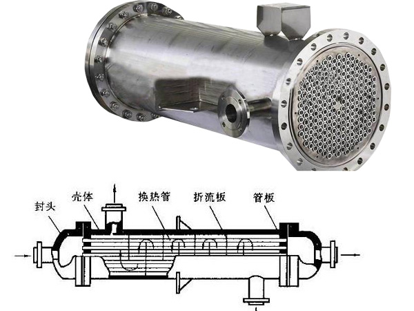 管壳式换热器由壳体、传热管束、管板、折流板(挡板)和管箱等部件组成。壳体多为圆柱形,内有管束,管束两端固定在管板上。传热有两种热流体和冷流体,一种是管内流体,称为管侧流体;另一种是管外流体,称为壳侧流体。
