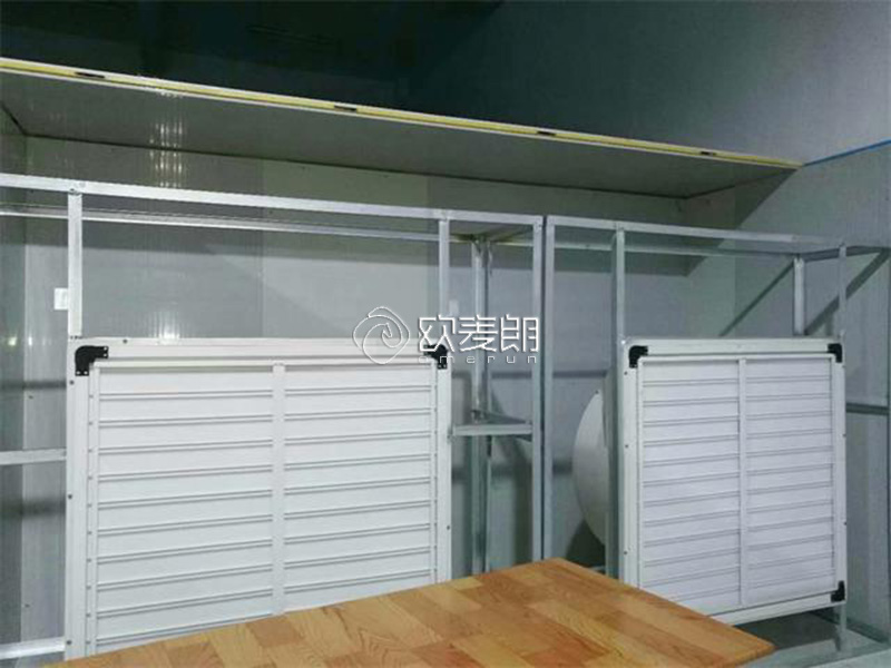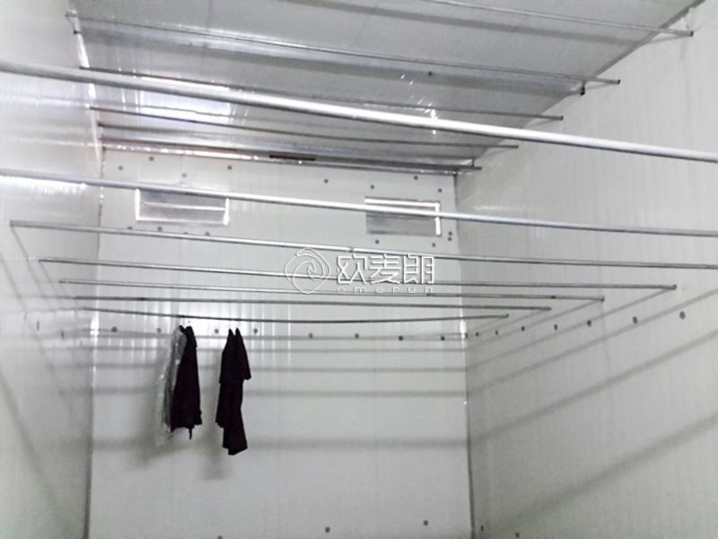 由10CM厚度保温板材组成密闭房间,热泵主机吸收环境当中热能,传导到密闭保温房内,通过烘干房内多台独立轴流风机形成360度闭式循环风,持续吹干烘干房内衣服。