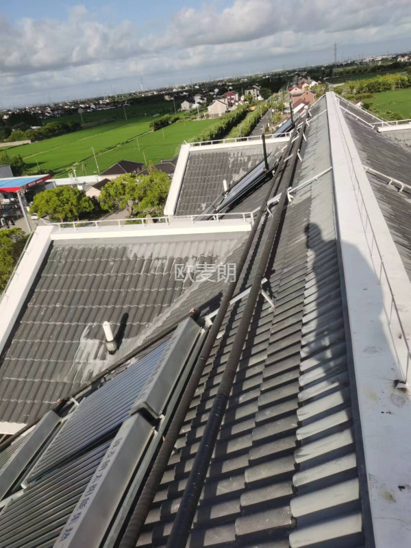 系统配置:一个圆形保温水箱+欧麦朗空气能热泵机组+9组太阳能集热器