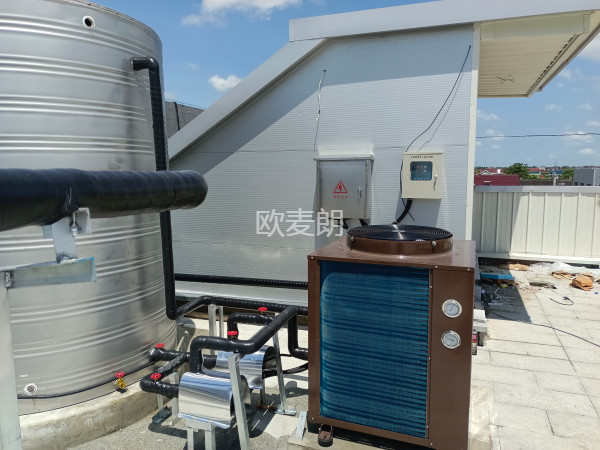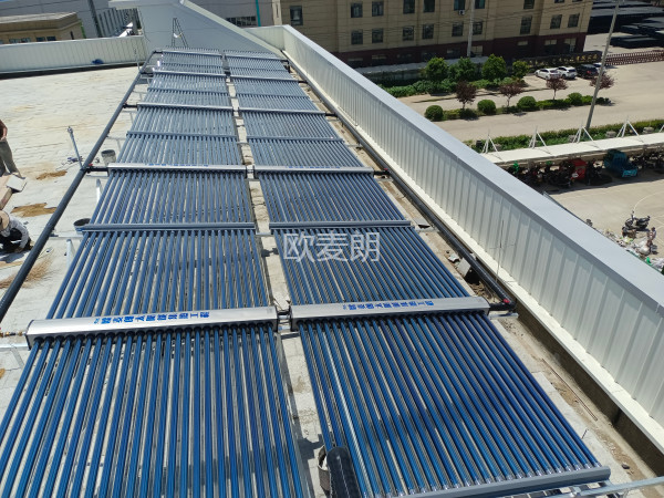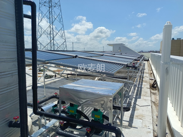 项目配置:10组太阳能集热模块+欧麦朗空气能热泵热水机组+圆形水箱