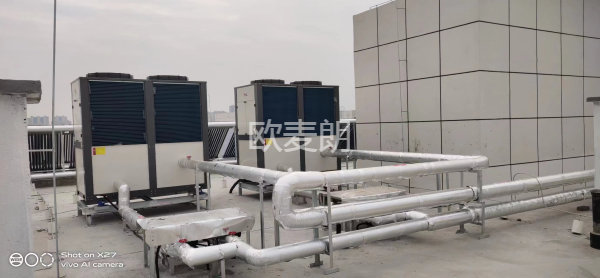 项目配置:56组真空管太阳能集热器+2台欧麦朗低温空气能热泵机组+方形保温水箱