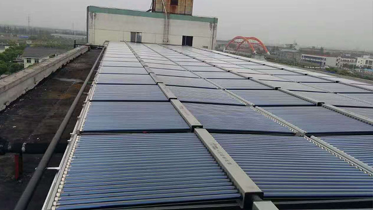 该热水循环系统主要遵循工业用热水循环的标准,使用2500多支太阳能真空管用于夏季制取生产用的高温回收热水。整个系统使用了多套管式太阳能集热器、热水循环泵、大型水箱等,安装在厂房楼顶的空地上。安装人员通过专用工程数据和综合实际安装现实,在楼顶调整好集热板角度,使大限度获得太阳能源,又能满足工厂对楼顶安装太阳能的要求。