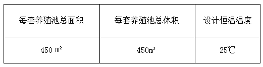 每套养殖池:表面积450㎡,容积450m?;每天补充新水0.2%之间;设计要求:温度水池温度维持在24-30℃之间。