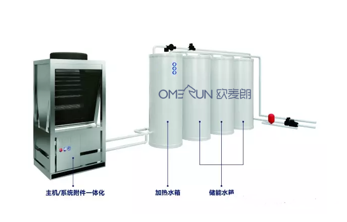 系统根据制冷压缩机作功,空气中能源迁移至水里,制冷剂不断循环系统,热泵机组持续消化吸收能源,根据冷却器开展率传热,将能源传送至封闭式水箱中;根据內部流水循环系统,将每一个控制模块承压水箱填满热水。