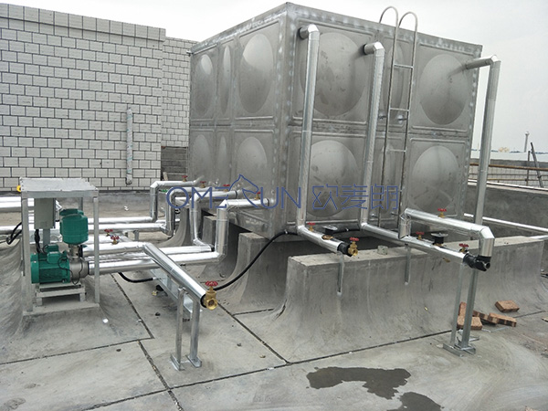 安装理念:考虑对方是化工企业,安全尤为重要,电锅炉采用封闭式运行,安静,没有噪音,没有污染。太阳能管道采用全铝皮包裹,彰显大气的同时,延长保温的衰弱速度;太阳能朝南布置,与楼面成25度夹角,保证太阳能在晴好天气下,充分集热。供水采用变频供水,保证在下班高峰期集中用水时,不会造成水压不稳,水温忽高忽低,提供用水舒适度。