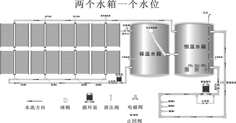 设备配置億彩:一台空气源热泵+多组太阳能集热器+集热水箱+保温水箱