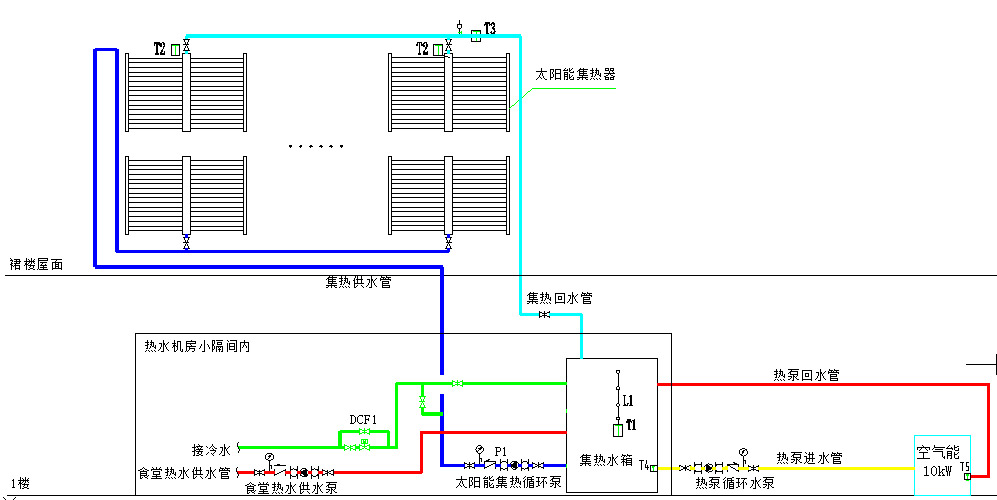 工程概况:南京某公司食堂及生活热水原来采用的是蒸汽换热产生的,鉴于蒸汽使用时,热力公司会根据低蒸汽流量来收取费用,夏季蒸汽主要用来生产生活热水,虽然耗热量不大,但每个月热力公司收取的费用很高。现在考虑7-9月份将蒸汽关闭,采用更经济节能的太阳能+空气源热泵的加热方式,来满足生活热水需求。