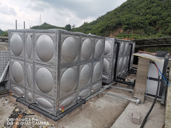 热水系统配置:30吨方形水箱,3台25P高温热泵机组