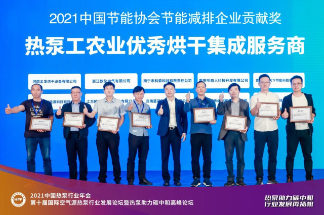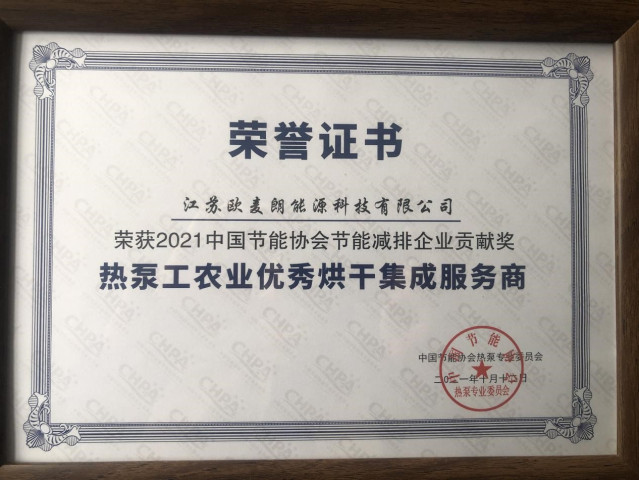 为表彰和奖励在我国热泵应用及研究领域做出突出贡献的组织和个人,推动热泵技术进步,促进产品市场应用,弘扬节能减排国策,助推可再生能源发展,树立行业品牌标杆,中国节能协会热泵专业委员会组织开展了“2021中国节能协会创新奖热泵行业节能减排科技进步奖和节能减排贡献奖”评选活动,欧麦朗凭借一流的研发水平、高效的系统集成能力、以及完善的售后服务体系,荣获“热泵工农业优秀烘干服务集成商”殊荣,这是对欧麦朗在烘干领域深耕多年成绩的充分认可和嘉奖,也必将激励我们在产品、技术、服务上再接再厉,永攀高峰,为国家节能减排的目标继续做出贡献!