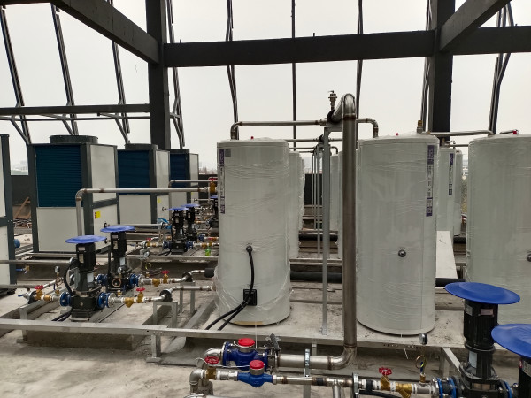 其中A座采用1台空气能热泵主机+500L承压水箱,B座采用8台空气能热泵主机+8个455L承压水箱+24个455L承压水箱(两套),C座采用3台空气能热泵主机+1个455L承压水箱+4个455L承压水箱。