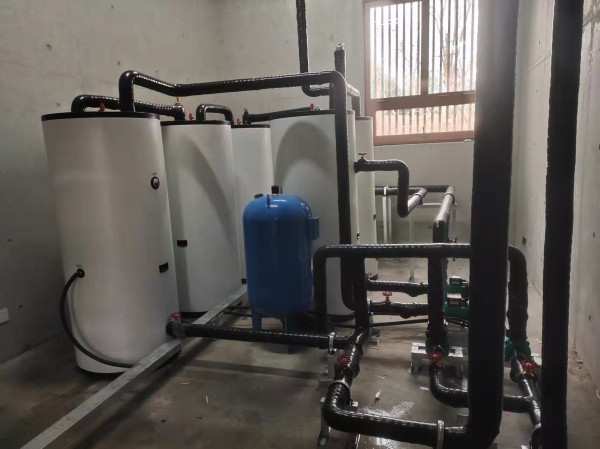 系统配置:采用一台空气源机组,一个455L电加热水箱、4个455L储水箱配置而成。整个系统承压出水,系统稳定性高。