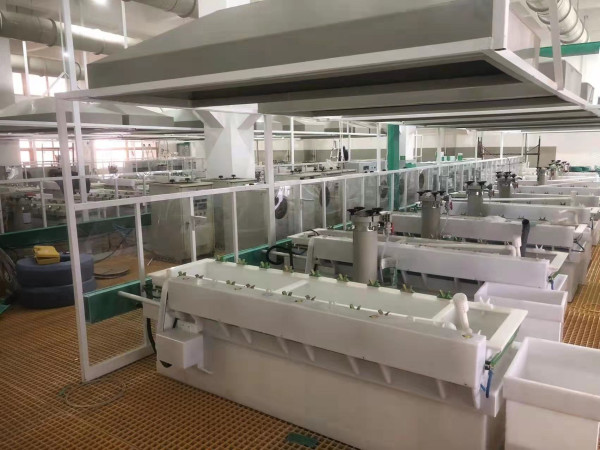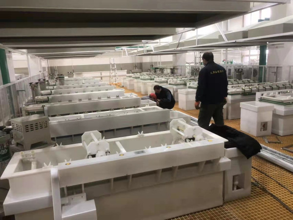车间内有30个挂镀槽。其中有2个90度的化学池不需要加热,2个35度的槽不需要加热,需要加热的槽液约15立方,需要恒温在50-55度,经过我司现场调查给出恒温方案:配置3台25匹低温机组,将缓冲水箱内的水烧至60度,与槽内的钛管进行间接换热,以保证槽液温度恒温在50-55度。