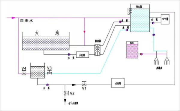 5.消耗热水大的是游泳的小池。小池游泳的温度是38℃,游泳的时间为15分钟,在30℃的室内环境中,能量损失是很小的。经实测发现,小池游完后水温在35~36℃。回收小池热水热量是系统能否在冬季满足需求的关键。将小池的排水管路接上水泵、电动阀V1和V2以及水处理设备。