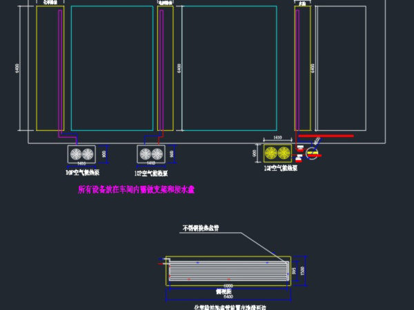 空气源热泵对缓冲水箱进行循环加热,加热至指定温度(60℃;可调节),缓冲水箱与池中不锈钢盘进行热交换,直至池中的水温达到生产要求;主机和缓冲水箱都放在车间内,夏天可以给车间适当降温,冬天车间内的环境温度高于0度,保证主机在冬天制热效率不受影响。