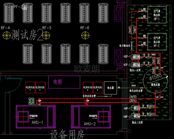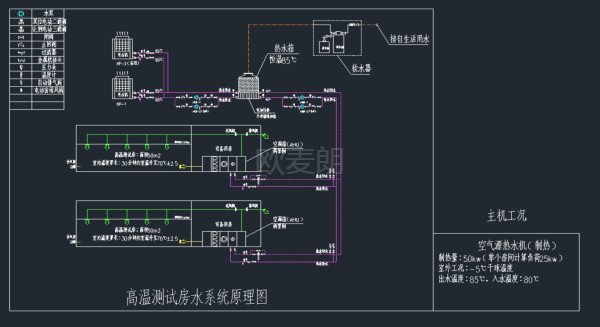 1、采用OML300-GW/FC复叠式高温空气源热泵产生 85℃高温水。主机采用一用一备,水泵采用一用一备,保证系统的安全。