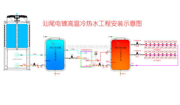 此次定制的50匹高温水源热泵机组是为广东汕尾电镀厂加热恒温系统配套使用,客户要求加热温度80度,欧麦朗工程师设计采用分体式复叠(双级耦合)高温热泵加热系统。第壹级配置一台50匹空气源热泵机和一只2吨的保温低温水箱,将水箱温度维持在35-40度。第二级配置定制的50匹高温水源热泵机组和一只2吨的保温高温水箱,将水箱温度维持在80-85度。空气源热泵加热的低温水箱作为高温水源热泵的热源,加热2吨高温水箱。达到蕞大化的节能效果。
