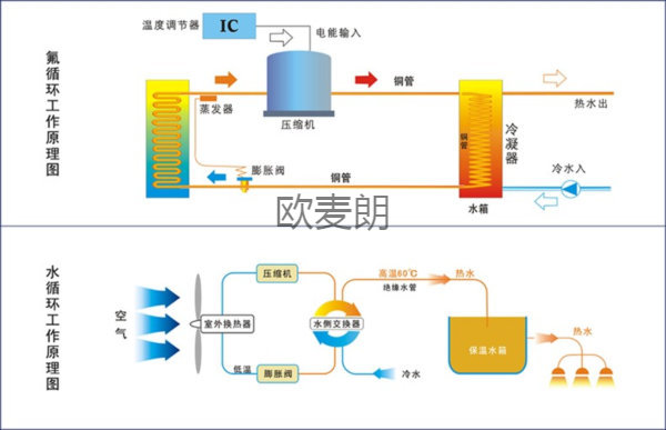 优点:由于主机与水箱的连接体是水管,所以不存在水箱漏氟现象并且不易结垢,制热速度比氟循环稍快。