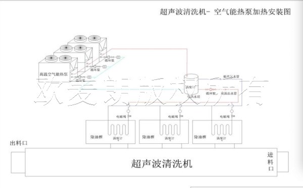 制热冷回收热泵加热,是通过空气能或余热水源制热高温热水,经过水泵流入清洗槽换热盘管,加热槽液,使的槽液温度恒温在50℃-70℃。每个槽体温度控制,采用电磁阀控制,当清洗槽温度没有达到要求,电磁阀打开,高温水进入盘管,加热槽液。当清洗槽温度到了后,电磁阀关闭,切断高温水,满足各清洗槽恒温要求。