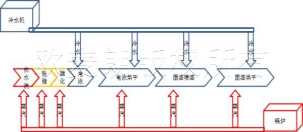 涂装车间一般工艺流程为前处理、电泳、电泳烘干、面漆喷漆、面漆烘干等工序,工序中有加热和冷却等需求,至今常规加热、冷却能源几乎都是燃气直接加热蒸汽(高压热水、温水)和冷冻机冷水。各需求之间独立处理,没有做能源回收再利用的整合处理,造成能源浪费,单产能耗高等问题。