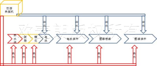 能源综合处理,蕞大的问题是冷热需求不匹配,经常出现冷需求多过热需求或热需求多过冷需求,造成系统不能稳定运行,双源热泵是以热能需求为目标,采用空气源和水源作为热源的热泵设备,有冷水需求时,以水源热泵运行,实现双产出,综合COP高,当冷水水温低于某个值后,自动切换到风源热泵运行,确保热能的产出。