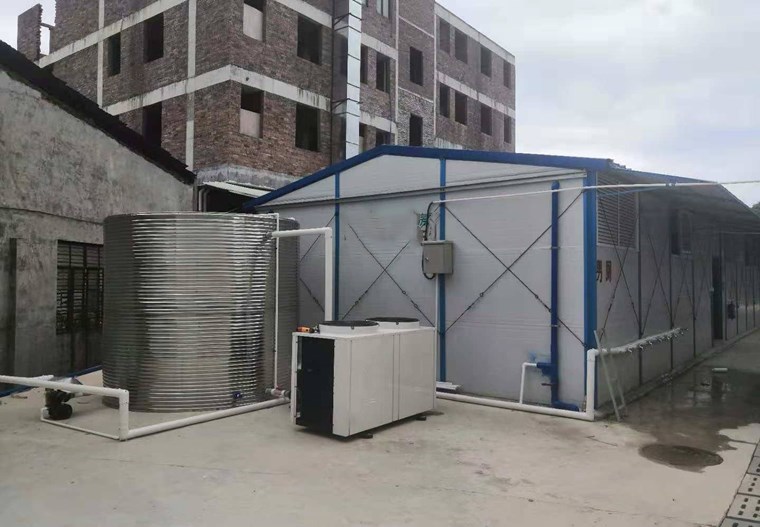 特大型空气能热泵机组厂家介绍工地宿舍区都会有集中冲凉房,只要加装喷头再接上空气能热水器水箱就能正常使用,工地工人工作环境都是比较脏的,所以用水量比较大,所以配置水量适当加大,出热水效率也要高才行,他们除了洗澡还会用来洗衣服。工地工人用水比较集中,建议使用康之源大小水箱,这个烧水模式出水量肯定高于其它机型。